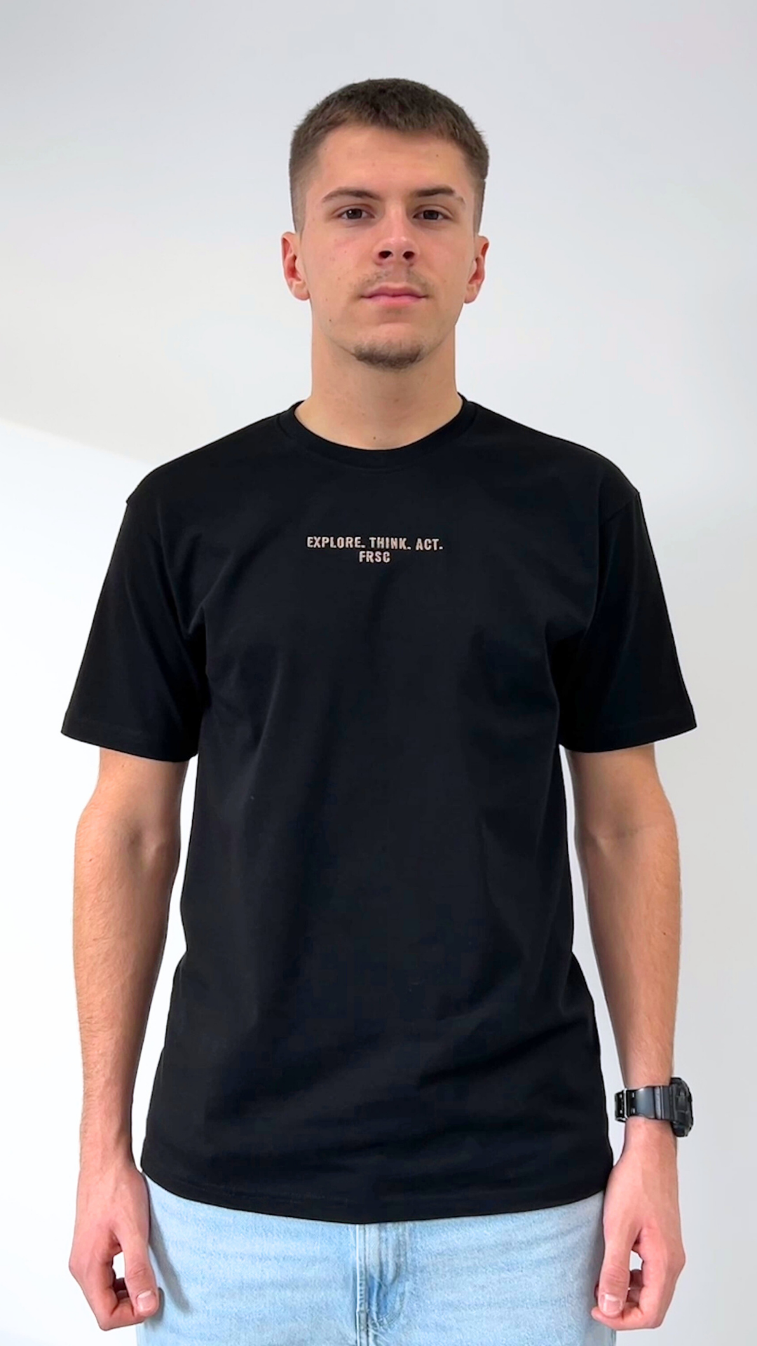 Męski t-shirt FRSc wykonany z wysokiej jakości dzianiny Heavy Jersey. Na środku klatki piersiowej znajduje się wyhaftowane hasło „EXPLORE. THINK. ACT. FRSc”, który dyskretnie podkreśla związek z koncepcją FRSc.